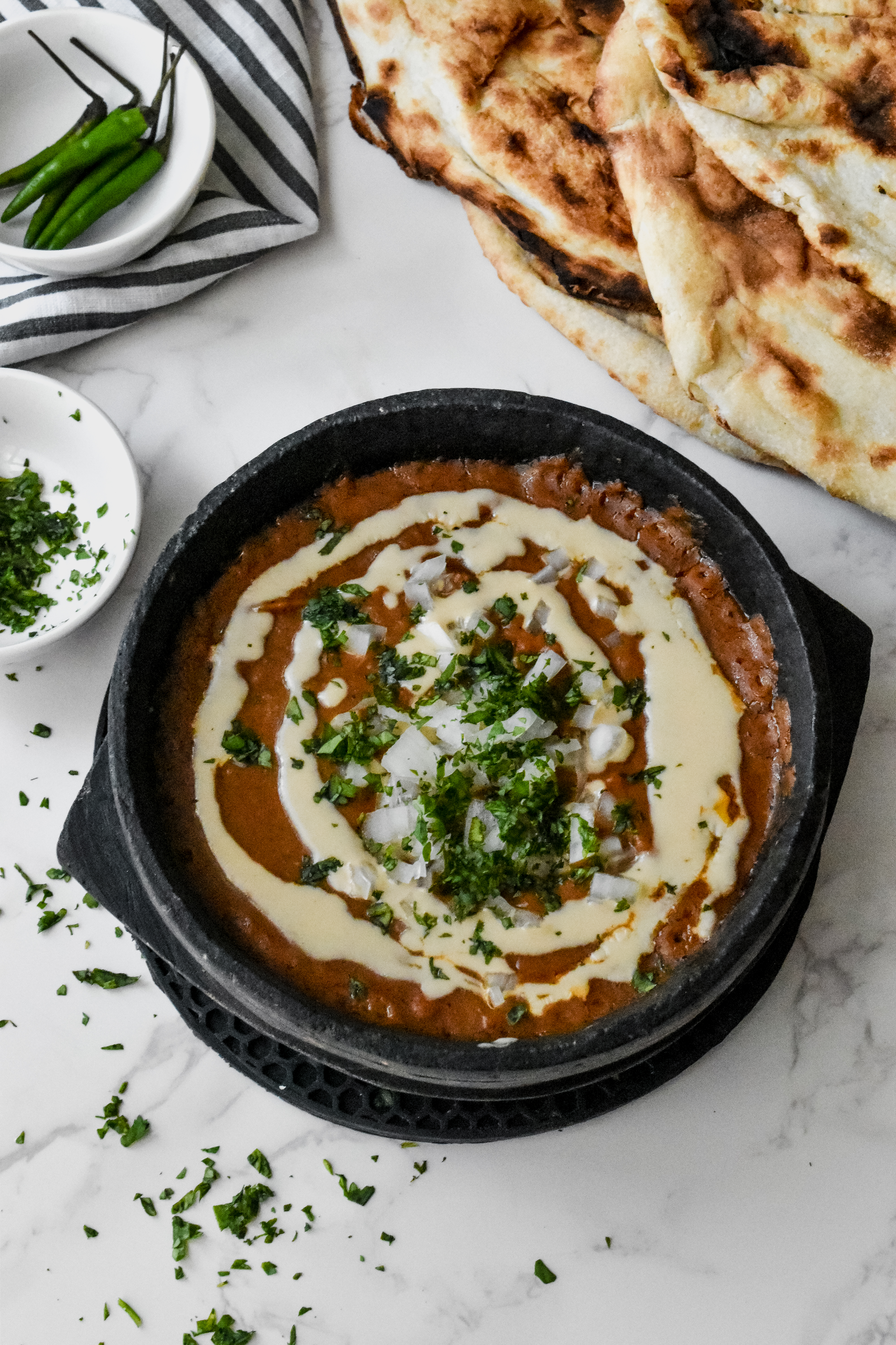 - Garnish with finely diced onions, chopped cilantro, and drizzle of tahini and ghee or olive oil. Serve hot with tanoor bread or pita bread.